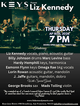Apr 16 Liz Kennedy 7:00 pm - 8:30 pm Keys Jazz Bistro 498 Broadway, San Francisco Event Details Get Directions